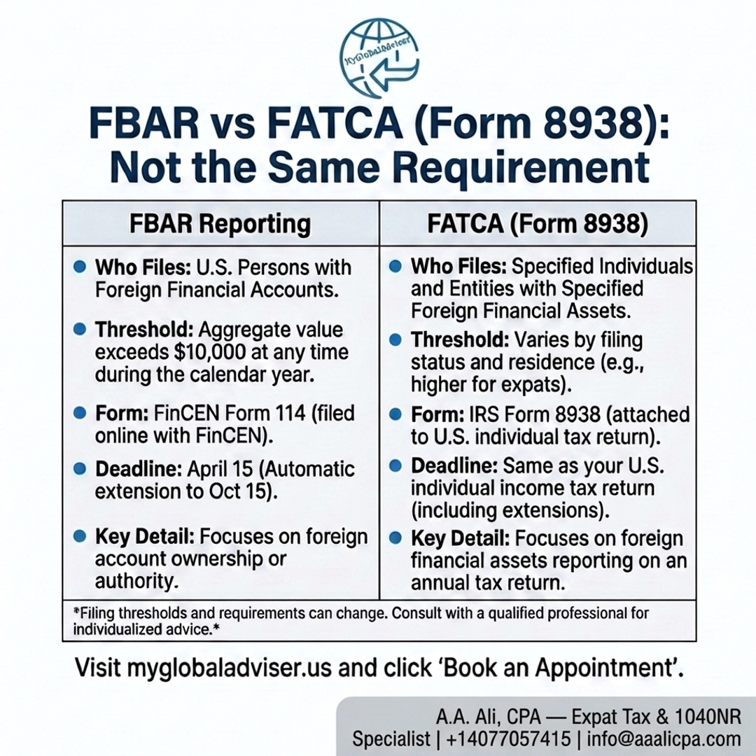 **Format:** Static comparison table (faceless). **Table rows:** - Governing body: FinCEN vs IRS - Filing method: separate e-filing vs attached to tax return - Who it generally applies to: “U.S. persons” vs “specified individuals” (high-level) - Thresholds: FBAR $10,000 aggregate at any time; FATCA higher thresholds depending on status/residency (avoid listing every threshold; keep general) - Due dates: align to tax return timing; highlight FBAR April 15 with automatic Oct 15 extension **Compliance note:** “Thresholds and definitions vary; professional review may be appropriate.” **CTA (verbatim, educational):** “Visit myglobaladviser.us and click ‘Book an Appointment’.” **Hashtags:** #myglobaladviser #taxseason #fbar #fatca #irs **Canva link:** https://www.canva.com/ (add final design link here)